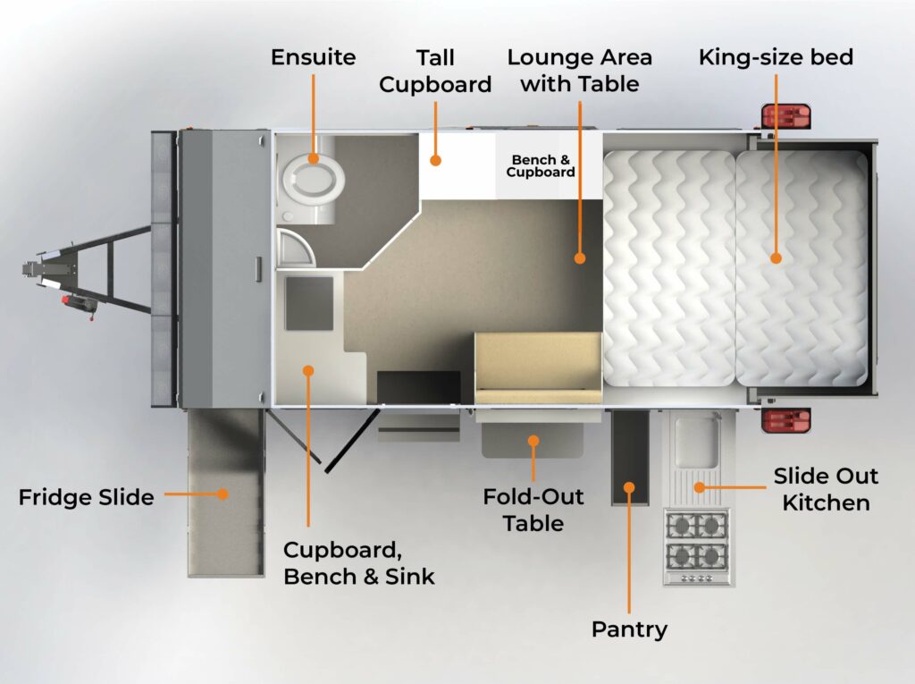 The OP-13 luxury camping caravan is a remarkable vehicle that combines maximum functionality and performance with all the comforts of home. It is the perfect companion for daring Australian off-road adventures with an unrivalled luxury caravan interior that includes the following: